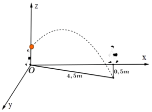 Trong giờ thể dục học về kỹ thuật chuyền bóng hơi, Bình và An tập chuyền bóng cho nhau. Ở một động tác Bình chuyền bóng cho An, quả bóng bay lên cao nhưng lại lệch sang bên trái của An và rơi xuống vị trí cách chỗ An đứng 0,5 m và cách chỗ Bình 4,5 m. Chọn hệ trục tọa độ Oxyz sao cho gốc tọa độ O tại vị trí của Bình, vị trí của An nằm trên tia Ox và mặt phẳng (Oxy) là mặt đất (tham khảo hình vẽ).