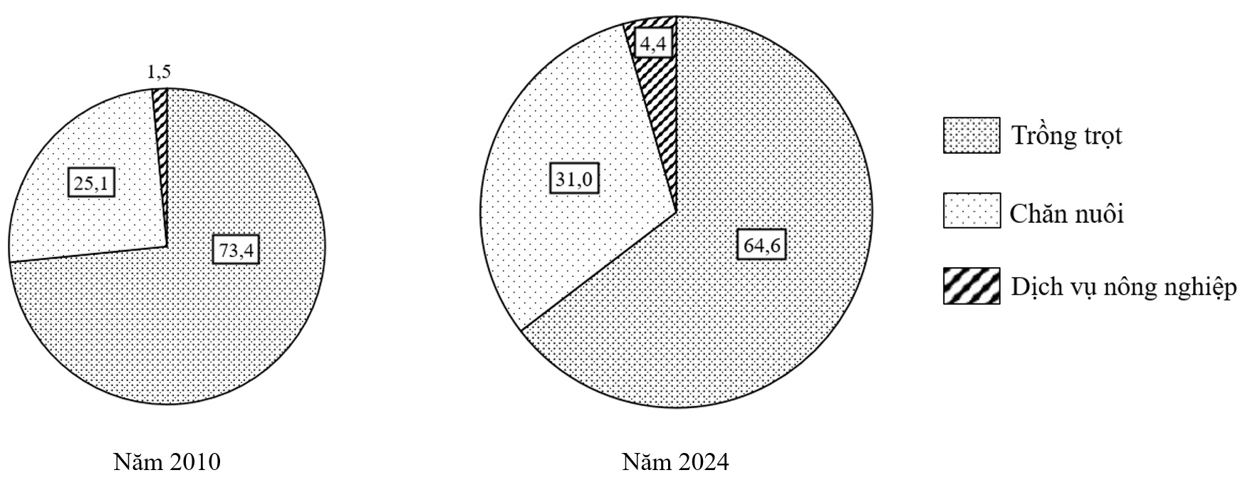 Quy mô và cơ cấu giá trị sản xuất nông nghiệp của nước ta năm 2010 và năm 2024 (Đơn vị: %)