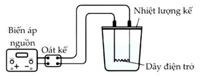 Nhóm học sinh làm thí nghiệm để xác định nhiệt dung riêng của nước. Họ lắp đặt bộ thí nghiệm như hình vẽ và tiến hành các bước: (1) Cân khối lượng nước và đổ vào nhiệt lượng kế; (2) Đo nhiệt độ nước trước khi đun; (3) Bật biến áp nguồn; (4) Đọc số chỉ của oát kế; (5) Sau $180\text{s}$, đọc nhiệt độ nước sau khi đun.
