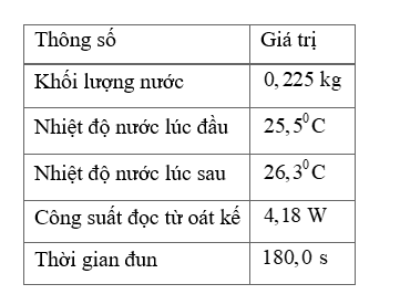 | c) Từ số liệu đo được như trong bảng trên, nhóm học sinh bỏ qua nhiệt lượng truyền cho vật khác xác định được nhiệt dung riêng của nước là $4160\text{J/(kg}\text{.K)}$. | ||