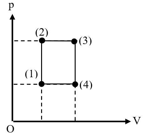 Một mol khí lí tưởng thực hiện chu trình $\left. (1)\rightarrow(2)\rightarrow(3)\rightarrow(4)\rightarrow(1) \right.$ như hình vẽ.
