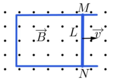 Một thanh kim loại MN có chiều dài $L$ được kéo với vận tốc $\overset{\rightarrow}{v}$ không đổi