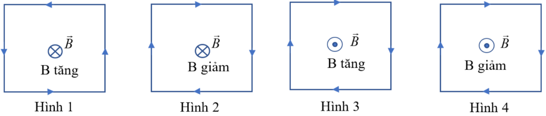 Một khung dây dẫn hình vuông đặt trong một từ trường có cảm ứng từ $\overset{\rightarrow}{B}$ sao cho các đường sức từ vuông góc với mặt phẳng khung dây. Thay đổi độ lớn của $B$ như các hình dưới đây, trong khung xuất hiện dòng điện cảm ứng. Hình vẽ nào dưới đây biểu diễn không đúng chiều của dòng điện cảm ứng?