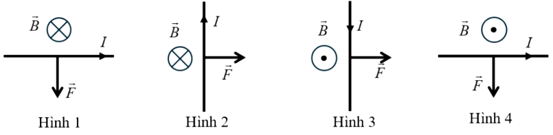 Hình nào dưới đây biểu diễn đúng chiều của lực từ $\overset{\rightarrow}{F}$ tác dụng lên dây dẫn mang dòng điện đặt trong từ trường đều?
