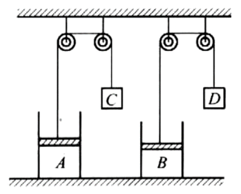 A và B là hai cylinder (xy lanh) giống hệt nhau được cố định trên mặt đất, chứa cùng một loại khí với khối lượng bằng nhau và ở cùng nhiệt độ. C và D là hai quả cân với $m_{C} > m_{D}$, được nối với piston (pít tông) của A và B. Ở trạng thái cân bằng, hai vật C và D ở cùng một độ cao đủ lớn. Bỏ qua khối lượng piston và mọi ma sát. Cho áp suất khí quyển là $p_{0}$; gia tốc trọng trường là $g$; diện tích tiết diện mỗi cylinder là $S$, thành cylinder đủ cao. Biết rằng, sau khi thực hiện quá trình đun nóng, nhiệt độ ổn định của khí trong cả hai cylinder đều tăng thêm $10^{0}C$.