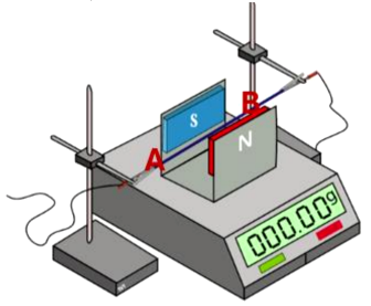 Một nam châm hình chữ U được đặt trên một mặt cân điện tử nằm ngang như hình vẽ. Một đoạn dây dẫn cứng được giữ cố định, nằm ngang và song song với hai cực từ của nam châm. Chiều dài phần dây dẫn nằm trong từ trường đều giữa hai cực của nam châm là AB = 10 cm. Ban đầu, chưa có dòng điện chạy trong dây dẫn, số chỉ của cân là 500,92 g. Sau đó, cho dòng điện không đổi với cường độ 0,80 A chạy trong dây dẫn, số chỉ của cân là 499,72 g. Bỏ qua sự ảnh hưởng của từ trường trái đất.