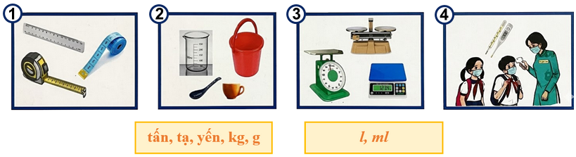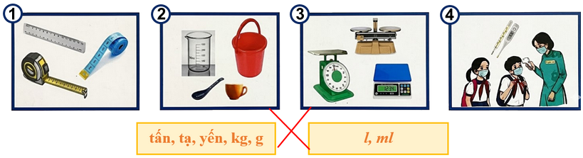 Nhận biết các dụng cụ đo khối lượng và dụng cụ đo thể tích, sức chứa trong thực tế để ghép với đơn vị đo tương ứng.