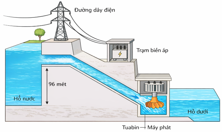 Một thiết bị chuyển đổi năng lượng nước (thường từ là dòng chảy, thác nước hoặc đập nước) thành năng lượng cơ học, sau đó sử dụng để phát điện. Thiết bị này thường được gọi là máy phát điện tuabin hoặc máy phát thủy điện. Hệ thống này là thành phần quan trọng trong các nhà máy thủy điện. Ở Việt Nam, nhiều nhà máy thủy điện lớn như Hòa Bình, Sơn La hay Trị An sử dụng nguyên lý này. Độ biến thiên nhiệt độ của nước bằng bao nhiêu Kenvin khi nước rơi từ độ cao như hình vẽ xuống và đập vào cánh tuabin làm quay máy phát điện, biết rằng 50% thế năng của nước làm nóng nước lên. Cho biết nhiệt dung riêng của nước là 4190 J/kg.K. Cho biết gia tốc trọng trường 10 m/s2 (Kết quả làm tròn đến 2 chữ số sau dấu phẩy thập phân).