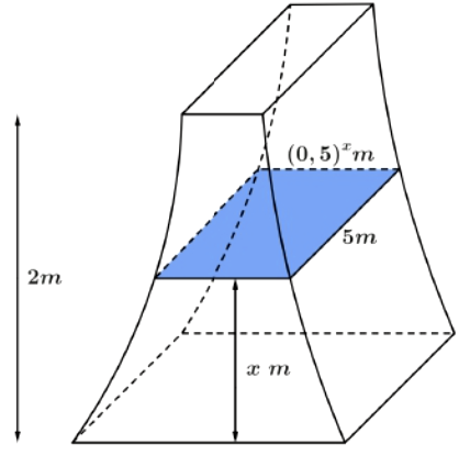 Một khối bê tông có chiều cao 2 mét được đặt trên mặt đất. Nếu cắt khối bê tông bởi một mặt phẳng nằm ngang và cách mặt đất $x$ mét ($0 \leq x \leq 2$) thì được mặt cắt là một hình chữ nhật có chiều dài 5 mét và chiều rộng bằng ${(0,5)}^{x}$ mét (xem hình dưới). Thể tích của khối bê tông đó bằng bao nhiêu mét khối (Kết quả làm tròn đến hàng phần mười)?