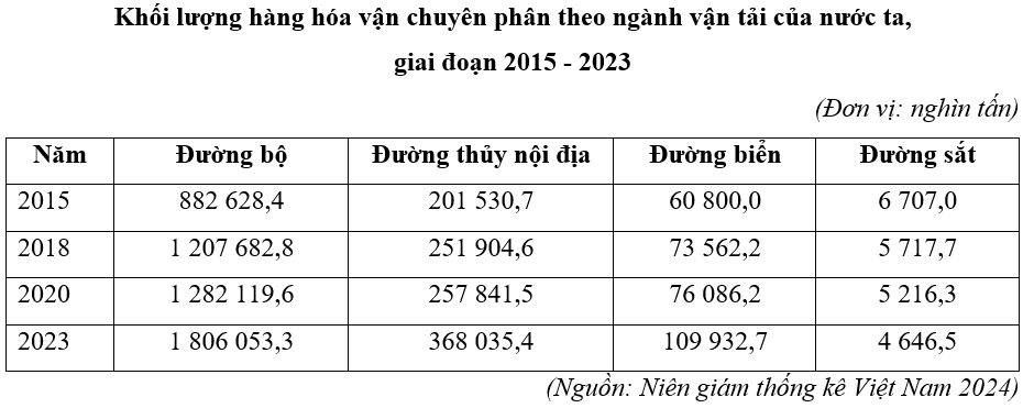 Căn cứ vào bảng số liệu trên, hãy cho biết trong giai đoạn 2015 - 2023, tốc độ tăng trưởng khối lượng hàng hóa vận chuyển đường thuỷ nội địa lớn hơn tốc độ tăng trưởng của đường sắt bao nhiêu phần trăm (làm tròn kết quả đến hàng đơn vị).