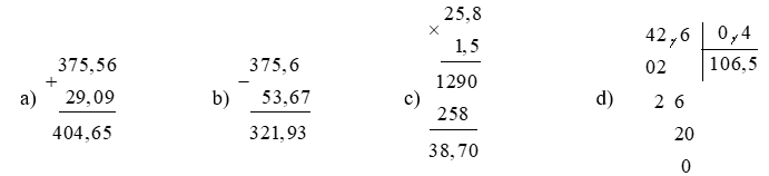 Đặt tính rồi tính. a) $375,56 + 29,09$ b) $375,6 - 53,67$ c) $25,8 \times 1,5$ d) $42,6\ :\