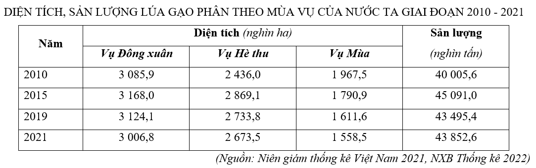 Cho bảng số liệu:Căn cứ vào bảng số liệu, hãy cho biết giai đoạn 2010 - 2019, diện tích vụ