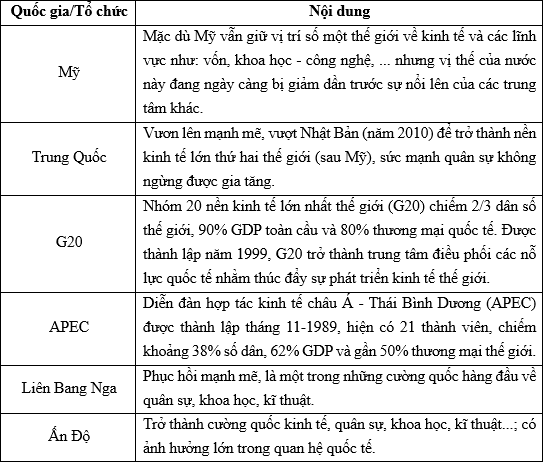 | a) Sự hình thành những trung tâm quyền lực mới trong quan hệ quốc tế tạo thời cơ và thách thức đối với sự phát triển của Việt Nam hiện nay. | ||