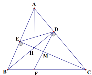 c) Chứng minh các tứ giác AEHD và HDCF nội tiếp để suy ra $\angle HDE = \angle HDF$. Từ đó suy ra DH là tia phân giác của $\angle EDF$. Áp dụng tính chất đường phân giác trong tam giác EDM để suy ra hệ thức cần chứng minh.