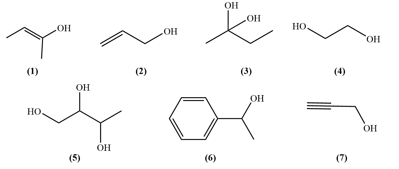 Những alcohol bền (có thể tồn tại độc lập) trên thực tế đều có đặc điểm là nhóm -OH liên kết với các nguyên tử carbon no và mỗi nguyên tử carbon chỉ liên kết tối đa với một nhóm -OH. Cho các hợp chất có công thức cấu tạo sau:
