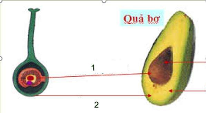 – Quan sát hình ảnh minh họa cấu trúc quả bơ và các đường kẻ (1) và (2) nối với các bộ phận bên trong quả.