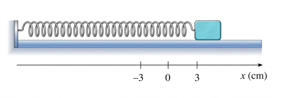 Cho con lắc lò xo dao động trên mặt phẳng nằm ngang không ma sát như trong hình. Con lắc lò xo thực hiện mỗi dao động mất 2,4 s. Tại t = 0, vật bắt đầu dao động từ chỗ cách vị trí cân bằng x = 3 cm.