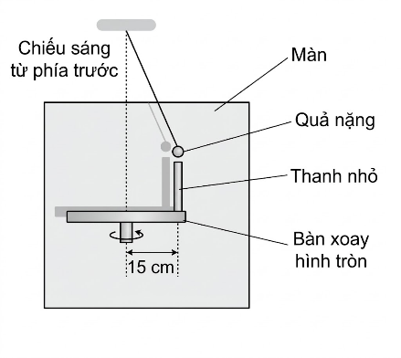 Hình bên là sơ đồ của một bàn xoay hình tròn, có gắn một thanh nhỏ cách tâm bàn 15 cm. Bàn xoay được chiếu sáng bằng nguồn sáng rộng, song song, hướng chiếu sáng từ phía trước màn để bóng đổ lên màn hình. Một con lắc đơn dao động điều hoà phía sau bàn xoay với biên độ bằng khoảng cách từ thanh nhỏ đến tâm bàn xoay. Tốc độ quay của bàn quay được điều chỉnh là $2\pi$ rad/s. Bóng của thanh nhỏ và quả nặng của con lắc luôn trùng nhau. Chọn gốc thời gian là lúc con lắc ở vị trí hiển thị trong hình bên.