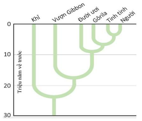 Sự sống trên Trái Đất được hình thành và phát triển qua 3 giai đoạn gồm: tiến hóa hóa học, tiến hóa tiền sinh học và tiến hóa sinh học. Hình vẽ dưới đây mô tả mối quan hệ họ hàng giữa người và một số loài vượn hiện nay. Hãy sắp xếp các nhận định đúng dưới đây theo thứ tự từ lớn đến nhỏ khi nói về sự phát sinh sự sống trên Trái Đất và mối quan hệ giữa các loài trong hình vẽ dưới đây: