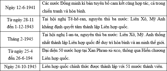 | a) Bảng thông tin trên thể hiện quá trình hoạt động của Liên hợp quốc trong giai đoạn cuối của Chiến tranh thế giới thứ hai. | ||