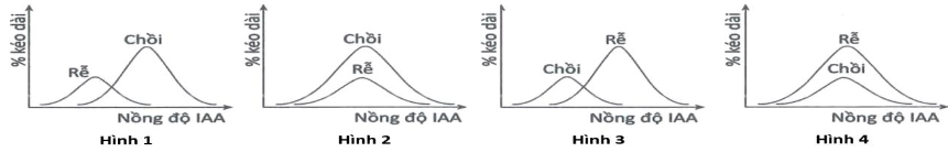 Auxin ở nồng độ thích hợp có thể kích thích sự kéo dài tế bào ở một số bộ phận của cây. Tuy nhiên, mức độ phản ứng của các mô khác nhau đối với nồng độ auxin là khác nhau. Cụ thể, tế bào rễ nhạy cảm với auxin hơn so với tế bào ở chồi. Đồ thị nào sau đây mô tả đúng nhất mối quan hệ giữa nồng độ auxin và mức độ sinh trưởng của rễ và chồi?