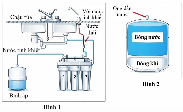 Sau khi lọc, nước tinh khiết được dẫn vào bình áp để tích trữ trước khi đưa lên vòi sử dụng. Trong bình áp có bóng chứa nước và bóng chứa khí ngăn cách với nhau bằng màng đàn hồi (Hình 2). Tổng thể tích của hai bóng bằng thể tích trong của bình. Coi khối khí trong bóng khí là khí lí tưởng có nhiệt độ không đổi, bỏ qua thể tích ống dẫn nước.