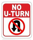 Biển báo có chữ "NO U-TURN" và biểu tượng mũi tên quay đầu nằm trong vòng tròn đỏ có gạch chéo.