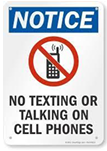 Thông báo ghi "NOTICE - NO TEXTING OR TALKING ON CELL PHONES" kèm hình điện thoại bị gạch chéo.