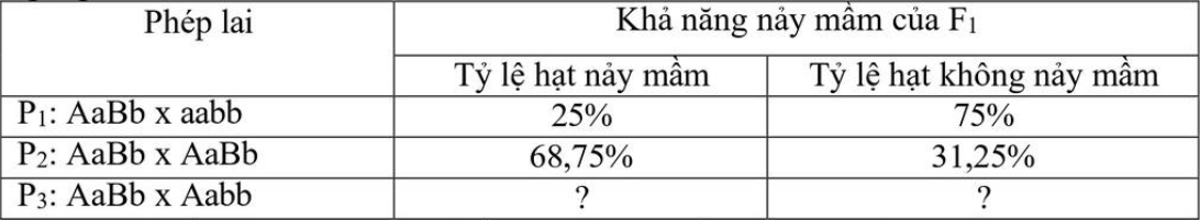 Ở một loài thực vật, quá trình tổng hợp hormone gibberellin (GA) do hai cặp gene Aa và Bb phân ly độc lập quy định. Khả năng nảy mầm của hạt phụ thuộc vào hàm lượng GA được sinh ra. Cho các phép lai sau: