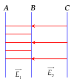 Cho 3 bản kim loại A, B, C đặt song song như hình vẽ, các bản được tích điện và điện trường giữa các bản là điện trường đều, có chiều như hình. Biết ở vùng AB, các đường sức điện có khoảng cách bằng một nửa khoảng cách ở vùng BC. Cường độ điện trường ở vùng AB có độ lớn $E_{1} = 150\text{V/m}$. Xét tính đúng sai của các phát biểu sau: