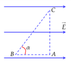 | c) Công của lực $\overset{\rightarrow}{F}$ khi điện tích q đi từ C đến A là $A_{CA} = qE.BC\sin\alpha$. | ||