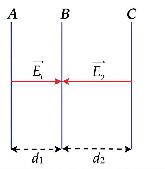 Cho 3 bản kim loại A, B, C đặt song song như hình vẽ, $d_{1} = 3\text{cm}$, $d_{2} = 7\text{cm}$. Các bản