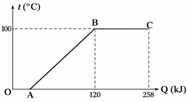 Một học sinh tiến hành đun một khối nước đá đựng trong nhiệt lượng kế từ $0^{0}C$ đến khi tan chảy hết thành nước và hóa hơi ở $100^{0}C$. Hình bên là đồ thị biểu diễn sự phụ thuộc của nhiệt lượng mà khối nước đá nhận được từ lúc đun đến lúc bay hơi và sự thay đổi nhiệt độ của nó. Lấy nhiệt nóng chảy riêng của nước đá là $3,3.10^{5}\text{J/kg}$ và nhiệt dung riêng của nước là $4200\text{J/kg}\text{.K}$, nhiệt hóa hơi riêng của nước là $2,3.10^{6}\text{J/kg}$, bỏ qua nhiệt dung của nhiệt lượng kế và sự trao đổi nhiệt với môi trường.