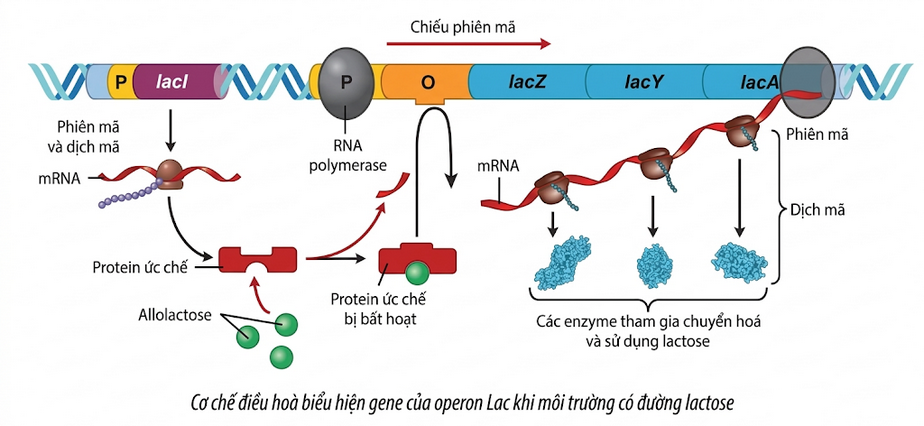 Chất cảm ứng (Lactose/Allolactose): Làm biến đổi cấu hình protein ức chế, khiến nó không bám được vào vùng O.