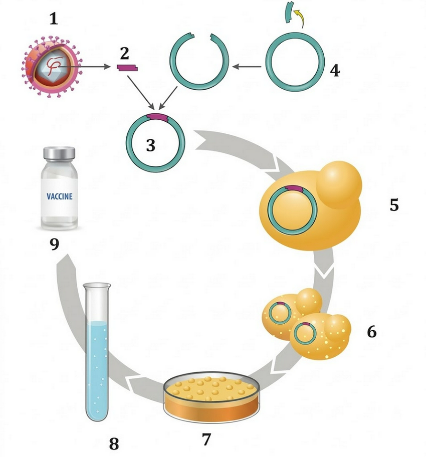 Nuôi cấy và thu nhận: Tế bào nhận nhân lên và biểu hiện gene để tạo ra protein kháng nguyên. Protein này được chiết tách để làm vaccine.