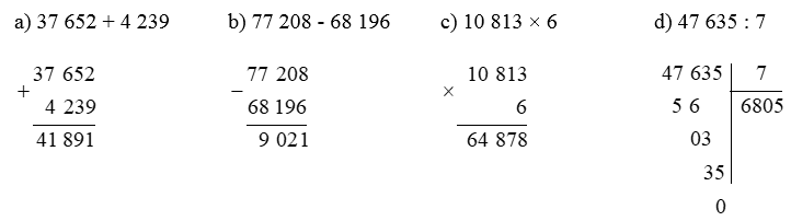Đặt tính rồi tính.a) 37 652 + 4 239b) 77 208 - 68 196c) 10 813 × 6d) 47 635 :