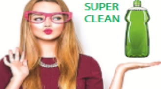 Quan sát hình ảnh: Một cô gái đang quảng cáo sản phẩm làm sạch với dòng chữ "SUPER CLEAN".