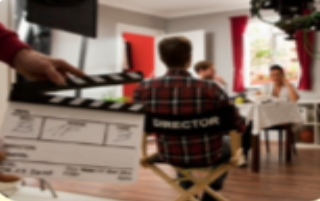 Quan sát hình ảnh: Một đoàn làm phim đang làm việc với máy quay, bảng clapper và ghế đạo diễn.