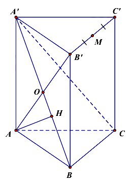 Cho hình lăng trụ đứng ABC.A'B'C' có đáy ABC là tam giác vuông tại B, $A'B = a\sqrt{3}$ và A'B tạo với đáy một góc bằng $60^{{^\circ}}$. Gọi M là trung điểm của B'C'. Khoảng cách từ điểm M đến mặt phẳng (A'BC) là