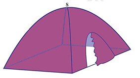 Một chiếc lều vải du lịch được cho như hình bên. Mặt đáy chiếc lều là khung sắt hình vuông cạnh 2 m, mặt cắt vuông góc với đáy đi qua đường chéo hình vuông cho ta hình ảnh các parabol có chung đỉnh S. Biết chiều cao của lều là SO = 135 cm, O là tâm của đáy. Chọn hệ trục tọa độ Oxy (đơn vị trên mỗi trục là mét) với Ox chứa một trong hai đường chéo hình vuông đáy, tia Oy đi qua đỉnh S của hai parabol; giả sử parabol (P) thuộc mặt phẳng (Oxy).