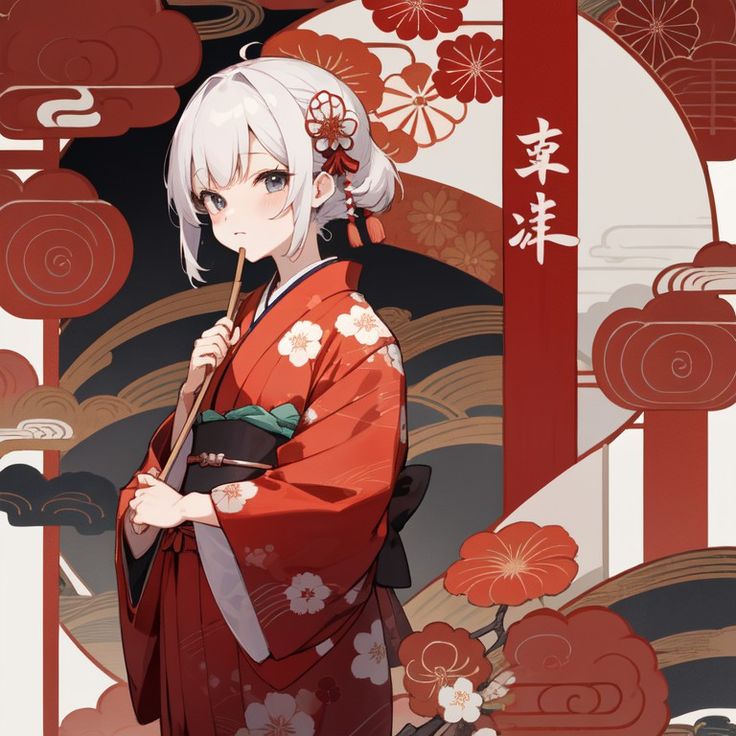 Dấu hiệu hình ảnh: Một nhân vật nữ mặc trang phục Kimono truyền thống của Nhật Bản, bối cảnh mang