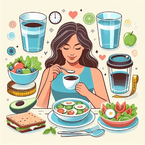 Dấu hiệu hình ảnh: Một người phụ nữ đang ăn một bữa ăn lành mạnh với nhiều rau củ quả, salad và nước