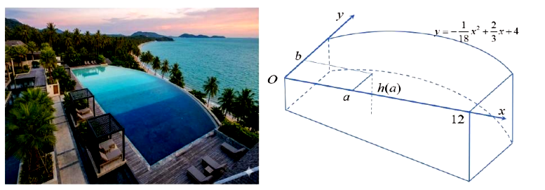 Một kiến trúc sư thiết kế một hồ bơi vô cực có mặt trên của bể bơi nằm trong mặt phẳng Oxy (đơn vị trục là mét). Một cạnh của hồ bơi dài 12 m nằm trên trục Ox; hai cạnh bên lần lượt nằm trên trục Oy và đường thẳng $x = 12$; cạnh còn lại (mặt vô cực) là một phần đồ thị của hàm số $y = - \dfrac{1}{18}x^{2} + \dfrac{2}{3}x + 4$. Đáy hồ bơi không phẳng mà độ sâu tại điểm $(a;b)$ được tính theo công thức $h(a) = \dfrac{1}{4}a + 1$ (mét). Thể tích nước tối đa mà hồ bơi có thể chứa là bao nhiêu $m^{3}$?