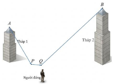 Một nhân viên cứu hộ đứng ở mặt đất, điều khiển một drone chở vật tư y tế, dự kiến bay thẳng từ đỉnh A của tháp thứ nhất đến đỉnh B của tháp thứ hai. Tuy nhiên, do gặp một một khu vực nhiễu sóng an ninh, nên drone phải bay thẳng từ A đến một điểm P trên mặt đất để hạ cánh. Nhân viên đó mang drone từ điểm P dọc theo hướng Tây $40\text{~m}$ đến điểm Q và sau đó drone bay thẳng từ Q lên đỉnh B của tháp thứ hai (Hình vẽ). Biết đỉnh A cao $100\text{~m}$ và có hình chiếu lên mặt đất cách vị trí người đứng ban đầu $200\text{~m}$ về phía Đông và $100\text{~m}$ về phía Nam. Đỉnh B cao $300\text{~m}$ và có hình chiếu lên mặt đất cách vị trí người đứng ban đầu $140\text{~m}$ về phía Tây và $200\text{~m}$ về phía Nam.