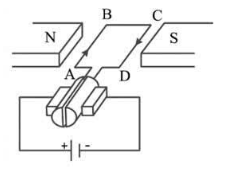Xe đạp điện, xe máy điện là các ứng dụng của động cơ điện một chiều. Nguyên lí hoạt động của động cơ điện một chiều được mô tả như hình vẽ bên. Khung dây hình chữ nhật ABCD có kích thước AB = 30,0 cm; BC = 20,0 cm; đặt trong từ trường đều giữa hai cực của nam châm có độ lớn cảm ứng từ là 0,60 T. Biết cạnh AB và CD luôn vuông góc với các đường sức từ.