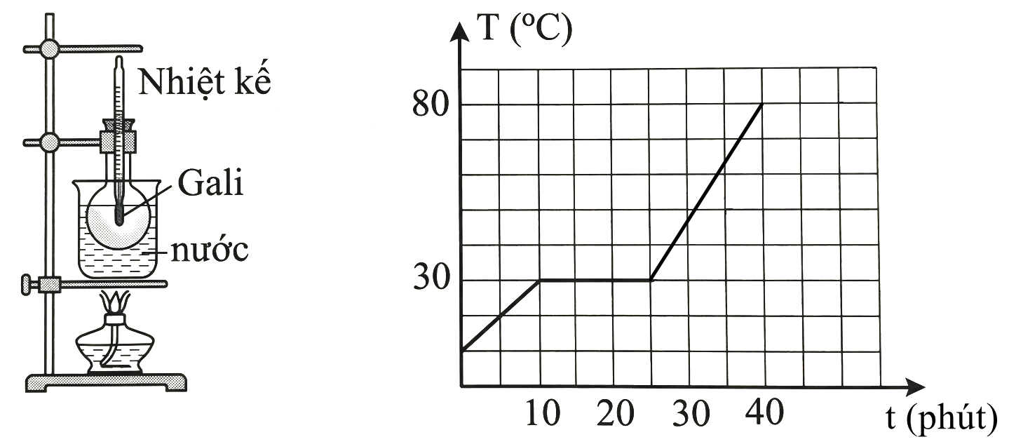 Trong thí nghiệm đun nóng một mẫu Gali (Ga), một học sinh vẽ được đồ thị sự thay đổi nhiệt độ theo thời gian như hình bên.