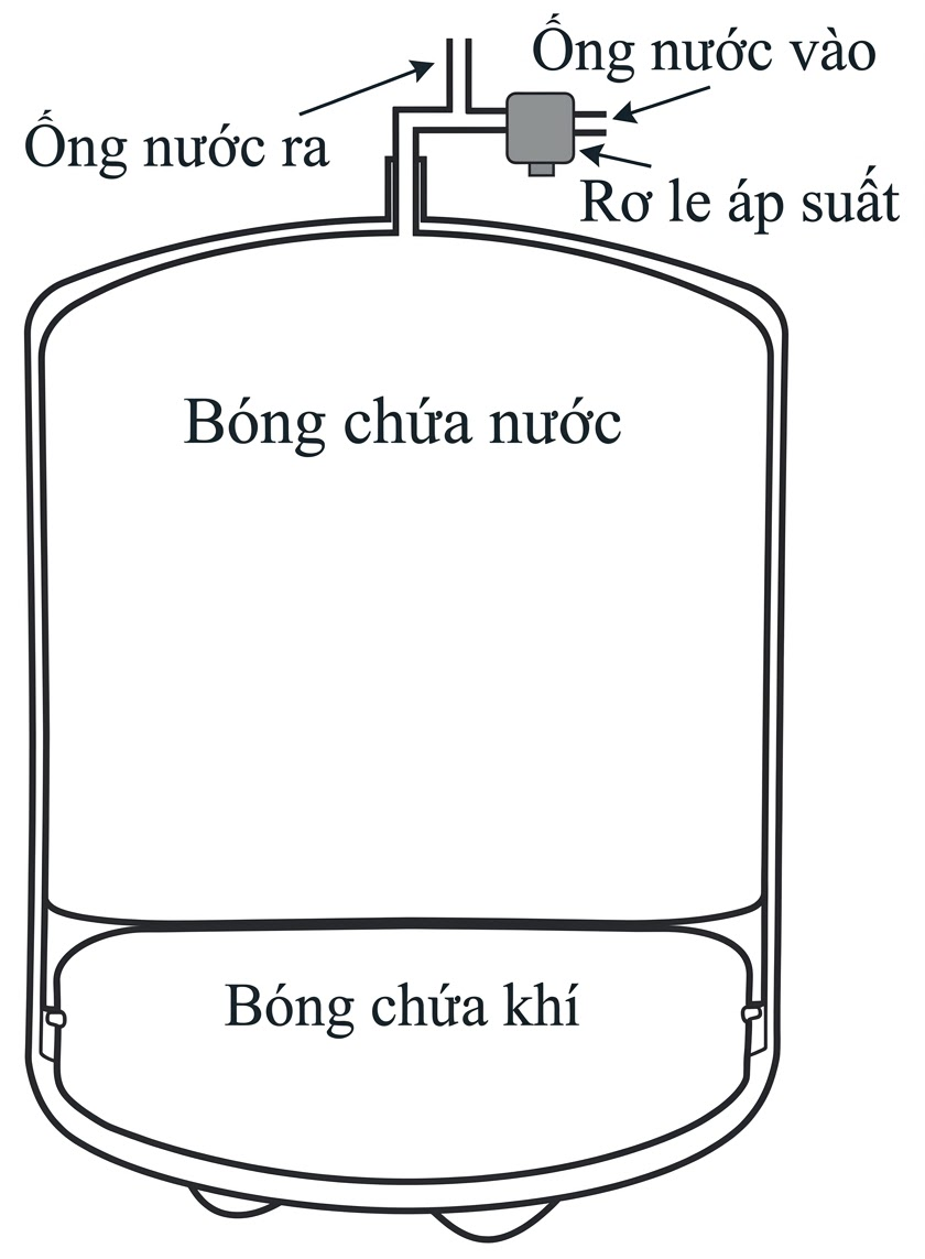 Một bình tích áp được sử dụng trong máy lọc nước có hai phần: bóng chứa nước và bóng chứa khí như hình bên. Khi chưa chứa nước, bóng chứa khí chiếm toàn bộ thể tích trong bình là 18 lít, áp suất $120kPa$. Đường ống dẫn nước vào, ra bóng chứa nước có gắn rơ le áp suất điều khiển đóng mở mạch điện. Khi lượng nước trong bóng chứa nước tăng đến 12 lít thì áp suất nước đạt cực đại, rơ le ngắt mạch, máy ngừng cung cấp nước vào bình. Khi lượng nước trong bình giảm còn $9$ lít, rơ le tự động đóng mạch để máy cung cấp nước trở lại. Coi nhiệt độ trong bóng chứa khí không đổi, các bóng mềm, tổng thể tích nước và khí trong bình bằng thể tích bình, mặt tiếp xúc của bóng chứa nước và chứa khí luôn có dạng phẳng.