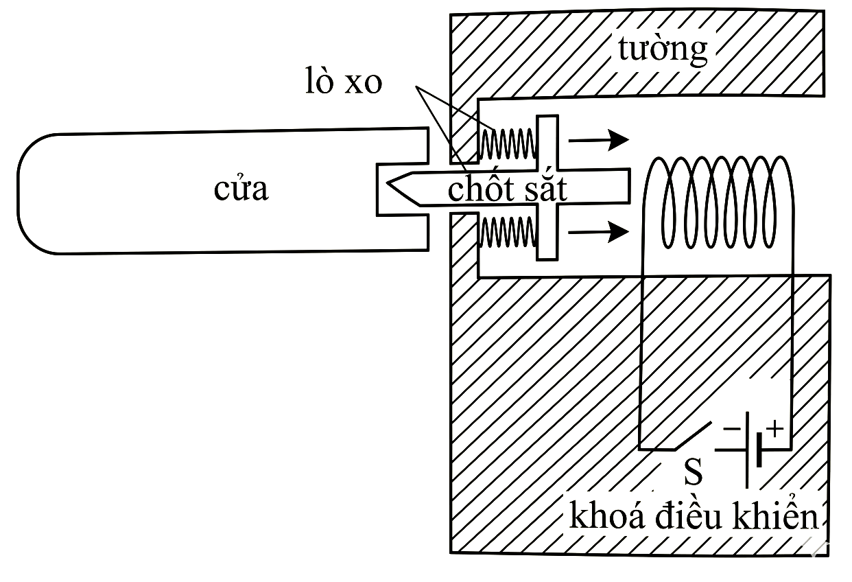 Hình bên mô tả cấu tạo của một khóa cửa điện từ dùng trong các hệ thống kiểm soát ra vào. Khóa gồm một chốt sắt có thể trượt ngang, được giữ ở vị trí khóa bởi các lò xo. Một cuộn dây đóng vai trò nam châm điện được đặt đối diện với đuôi chốt sắt. (Xác định theo chiều nhìn trong hình vẽ, cuộn dây đặt bên phải cửa)