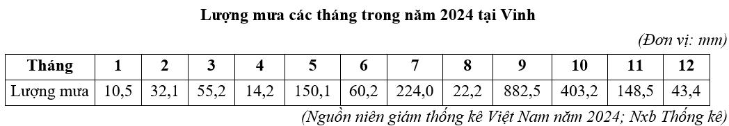 Căn cứ vào bảng số liệu trên, hãy cho biết tổng lượng mưa các tháng từ 100 mm trở lên tại Vinh năm 2024 là bao nhiêu mm (làm tròn kết quả đến hàng đơn vị)