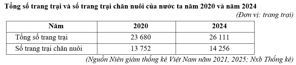 Căn cứ vào bảng số liệu trên, hãy cho biết tỉ trọng số lượng trang trại chăn nuôi trong tổng số trang trại của nước ta năm 2024 so với năm 2020 giảm bao nhiêu phần trăm (làm tròn kết quả đến một chữ số thập phân).